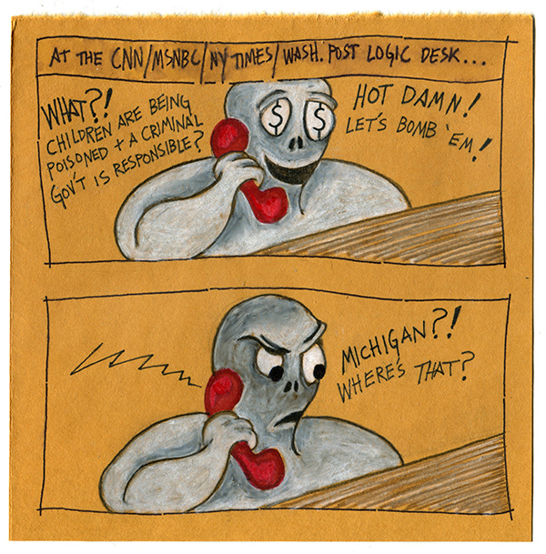 A cartoon addressing the mainstream media's shameless shilling for American imperialism while neglecting the country's deteriorating infrastructure.