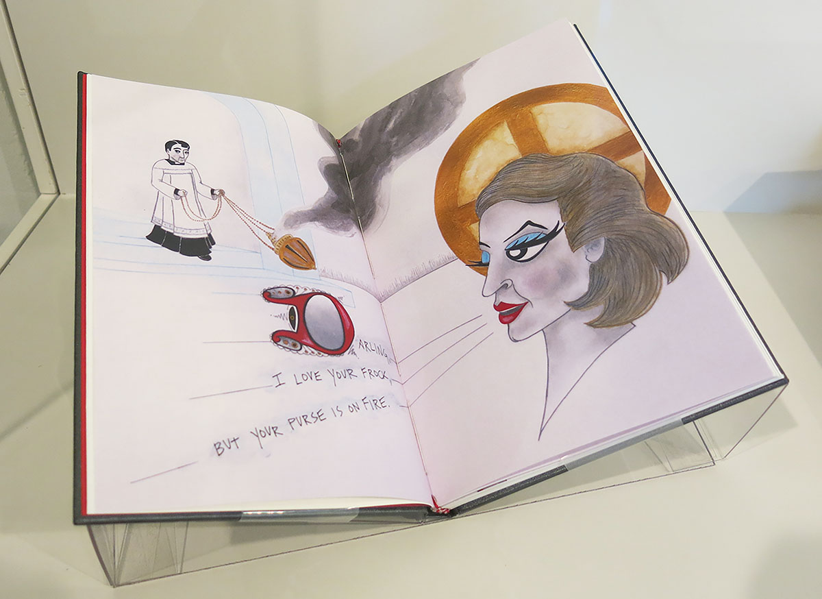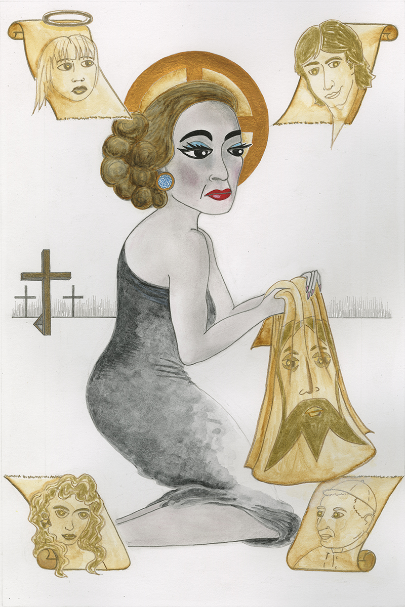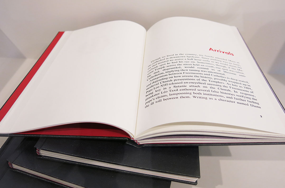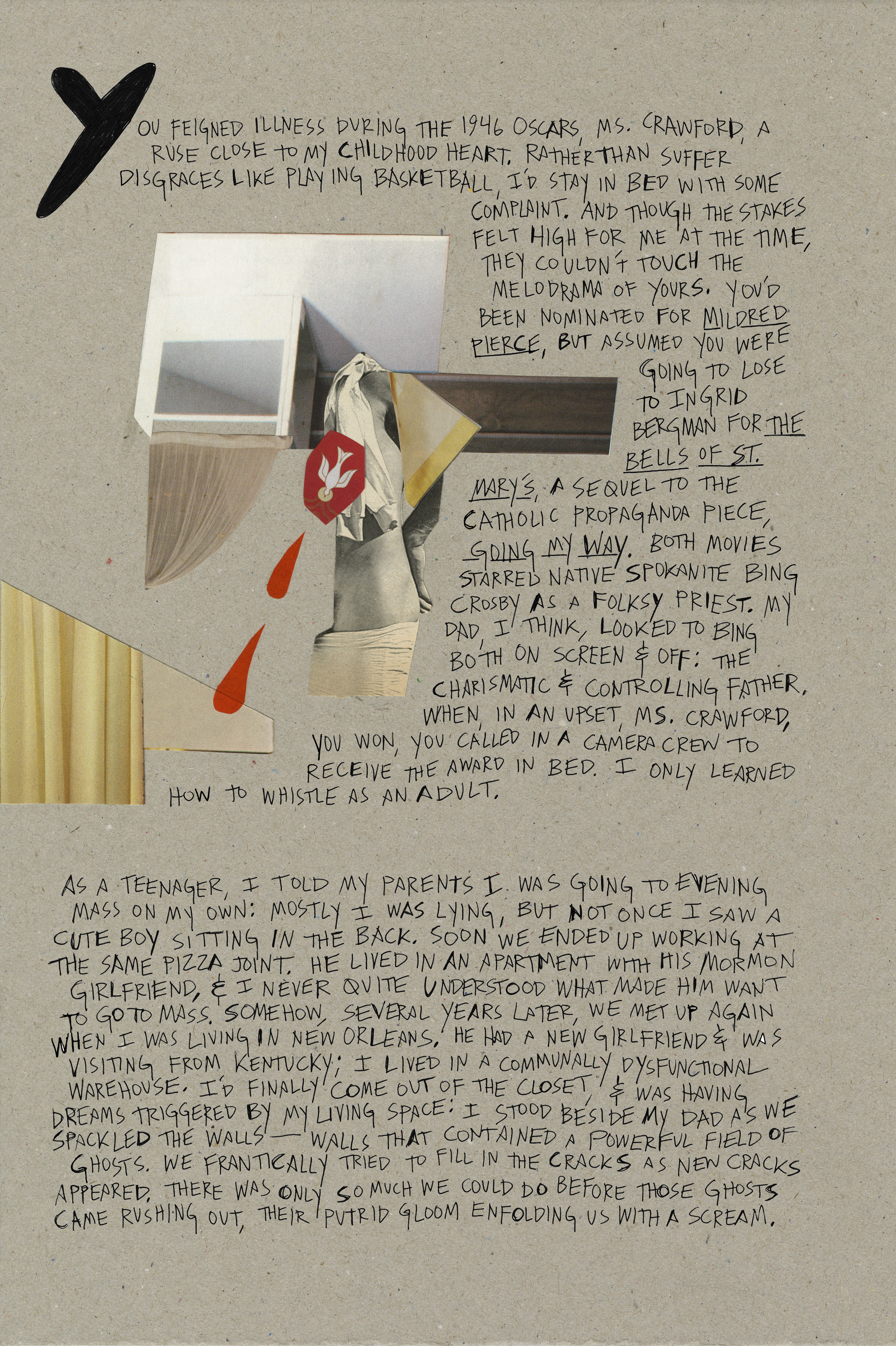 Catholics is an artist book, a limited-edition memoir that makes use of illustration, collage, and letterpress-printed typography to explore the psychic cathedral built by my Catholic traditionalist upbringing. Beginning with an anti-clerical quip by Tallulah Bankhead, the book takes on a range of subjects including Catholic-Masonic tensions, the fervency of converts, the legacy of the Legion of Decency, and the spiritual significance of revelatory shrouds. In Catholics, the sacred and profane, the humorous and tragic, the zine and literary fine-press all end up as strange bedfellows in desperate need of confession. The book's eight prose sections are both anecdotal and informational. Their design is a nod to twentieth-century trade publications—books, but also periodicals. In these sections, magazines and newspapers recur as central objects, and the tell-all nature of the book’s subject matter often feels worthy of the scandal sheets. Because of this, I’ve drawn inspiration from the designers, compositors, and printers who once worked to produce mass-market ephemera. The prose sections are letterpress printed from The Times New Roman type, cast and set by M & H Type. Also included at intervals, always on the recto, is a series of seven communion wafers/solar crosses. Printed with heavy impression from photopolymer plates, these images are surrounded by Bruce Rogers–inspired frames printed from metal typographic ornaments that alchemically shift throughout the course of the book. The wafers/solar crosses animate their own narrative, a transmuting framework that comments on the book’s other threads. This sequence was also adapted into a suite of prints. The book’s three illustrated saints—portrayed by Joan Crawford and Tallulah Bankhead—are directly referenced in the prose sections, as are the objects surrounding them. Their layout is inspired by the quincunx, a sacred formation where one central image is surrounded by four smaller objects at each corner. In Renaissance art, these four objects often represent aspects of the fourfold world: humors, elements, seasons, gospels, or some other system of correspon- dences.The book also features four illustrated page spreads. Three eulogiae—portfolios in the spirit of acheiropoieta (icons generated miraculously rather than by human hand)—rely heavily on collage. Sixth-century pilgrims to sacred sites in Europe carried away tiny clay or glass ampullae that contained traces of dirt, oil, or water found at the visited shrine. Diagram- matic images of the location were also rendered on the exteriors of these souvenirs, called eulogiae. Each eulogia in Catholics attempts to conjure remembered space in a similar way: handwritten text and collaged images function as both architecture and performance. Catholics is a project that is animist. During its creation I tried to tap into the energetic potential of material objects, whether magazine scraps or metal ornaments collecting dust in inherited type cases. Catholicism is ornately melodramatic, but it didn’t build that baroque on its own: the pagan cultures suppressed by the Church were also mined for their sacred objects and images, which were then re- purposed to maintain the Roman hierarchy’s power. And while Catholic traditions such as transubstantiation and acheiropoietia are concerned with an alchemical materiality, dogma has deadened any hope of real tran- scendence. Catholics is an attempt at subverting that co-optive past. While I’m inspired by the fine press printing tradition, I come from a zine-making back- ground, which makes me privilege the staticky effect of the photocopier and the chimerical results of collage. I’ve attempted to explore the tension between these modes, as well as those of commercial book and periodical design, and to ultimately integrate them in this work. The result, I hope, relies on a scaffold of traditional design adorned with material detritus that provoke memory. The book, with a trim size of 6 × 9 inches, was hand bound in a flat-spine, full-cloth case by the author in Spring 2015. The edition of 25 was funded in part by a grant from the Caxton Club.
