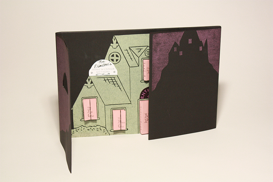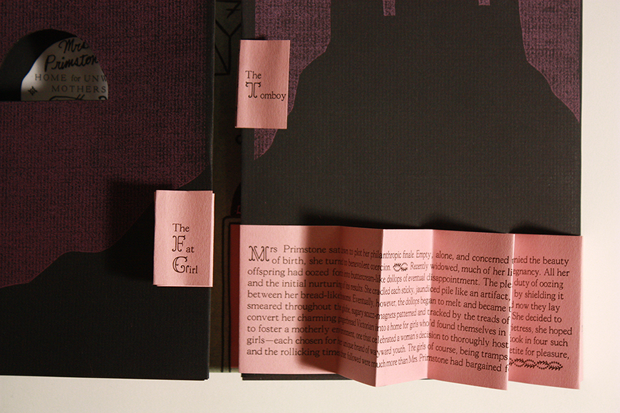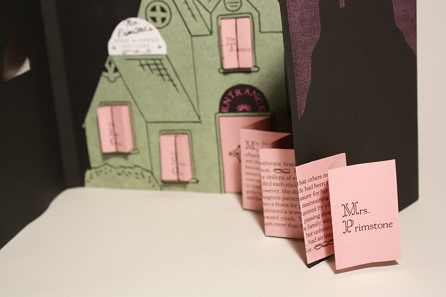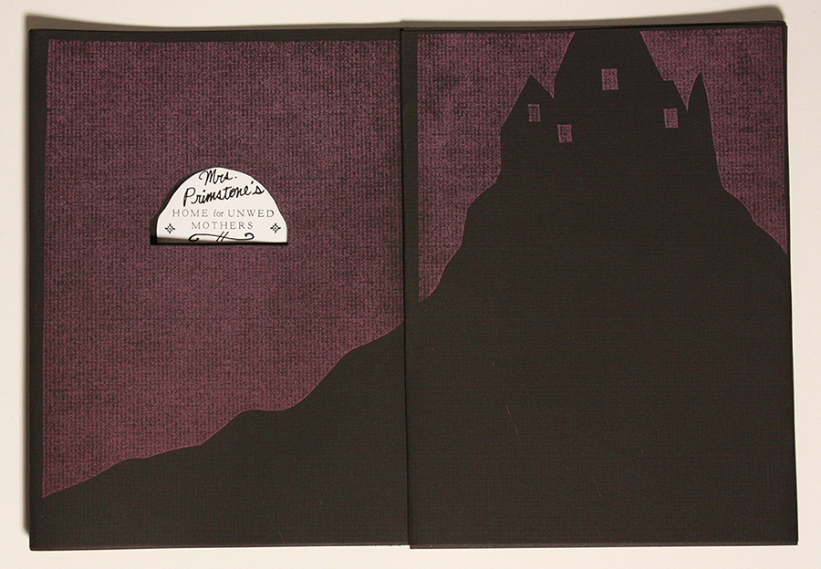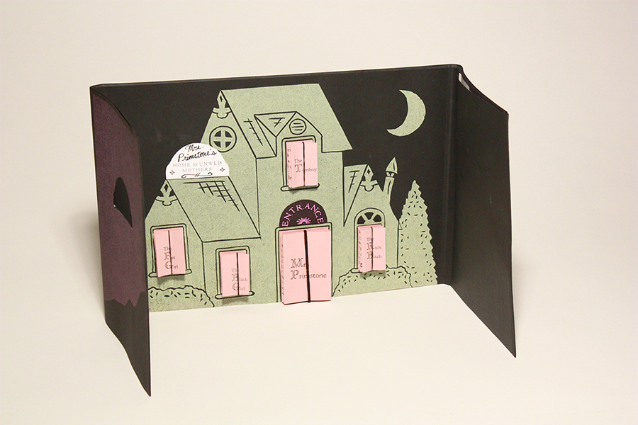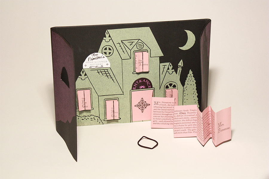 Mrs. Primstone’s Home for Unwed Mothers (2008) Mrs. Primstone’s Home for Unwed Mothers houses four 'inmates', based on the four feminine archetypes from the sitcom Facts of Life—but more wild, more delinquent. Taking the 'bun-in-the-oven' idiom literally, each of their pregnancies becomes a different pastry. The book’s form suggests these conflicting worlds of the sitcom; of sinister, antiquated sexual morals; and of baked goods. The cover is a linocut of the Victorian mansion from a distance—how a haunted mansion first appears in a horror movie. It opens from the middle to reveal a closer view of the mansion's gingerbread exterior, similar to the establishing shot in a sitcom. The story is then told in text printed on small accordions that fold out from the home's doors and windows.