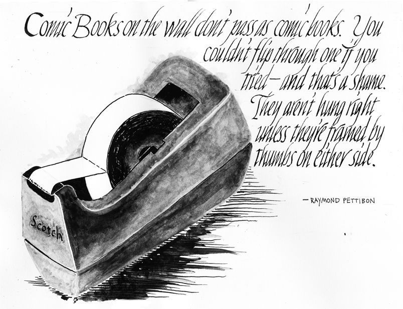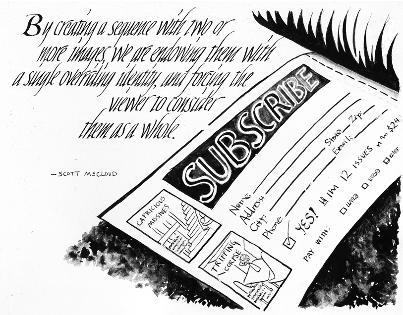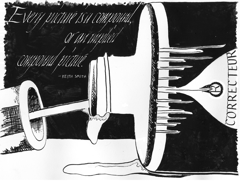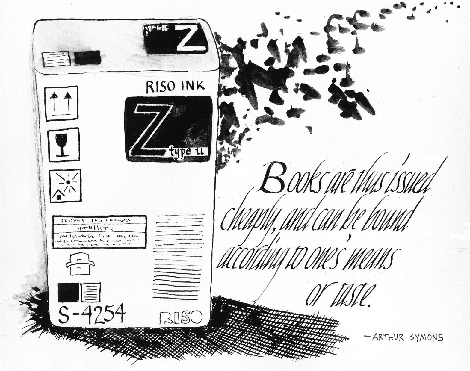 Out of the Copy Machine, Into the Streets was a panel presented at the 2014 College Book Art Association Conference in Salt Lake City. Presenters included Alexandra Janezic on the thematic overlap between riot grrrl zines and mass distributed women's comics, and Kalmia Strong on alternative printing techniques used in contemporary zines (you can view Kalmia's video presentation here). My paper talked about the general bookishness of the work of Raymond Pettibon, and in particular, the sequencing of the drawings in his early zines. The three of us collaborated on a zine where we each generated creative interpretations of our research, then mailed the zine (titled Think Kinko's) to the panel's attendees. My contribution was a series of Pettibon-inspired, calligraphic illustrations. |